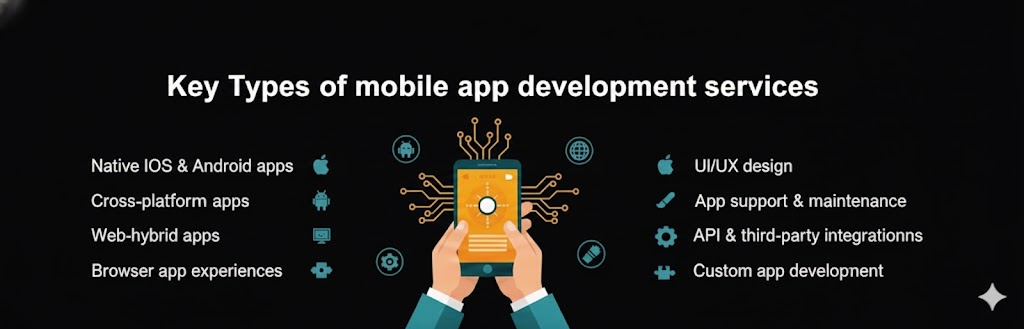 mobile app development services includes several service types, each built to match different business goals, platforms, and user needs. Each option has its benefits, be it the need to excel in performance, create quicker than others, or simply a solution that is compatible with every device.
